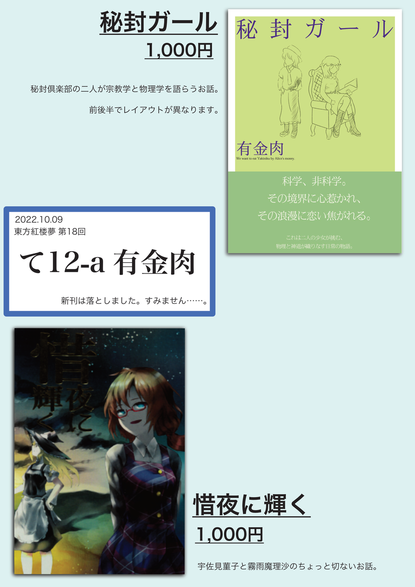 出そうとしていたのは前回の数学ガールオマージュ本「秘封ガール」の続編っぽい感じで,蓮子とメリーがそれぞれ何か学問について教え合うような教科書チックな小説.